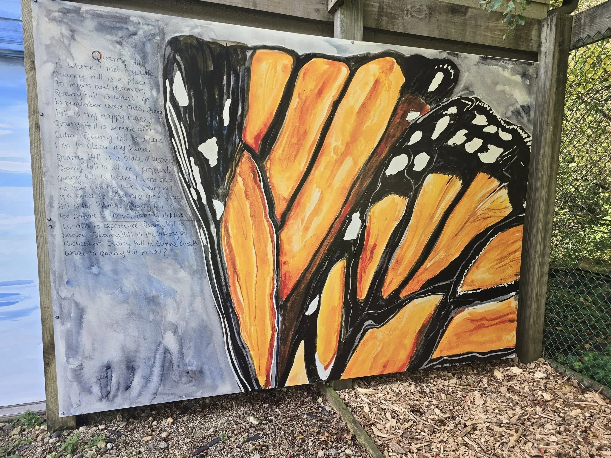 Quarry Hill project- I have done in person workshops and have asked attendees to help me design a large mural that will go onto the side of the garage as well as a cross stitch installation. There will also be a in person mural painting event where attendees can help paint the blocked off cave entrances.